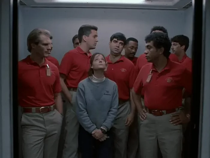 The confrontation with that male environment is shown visually more than once — for example, in the elevator scene: